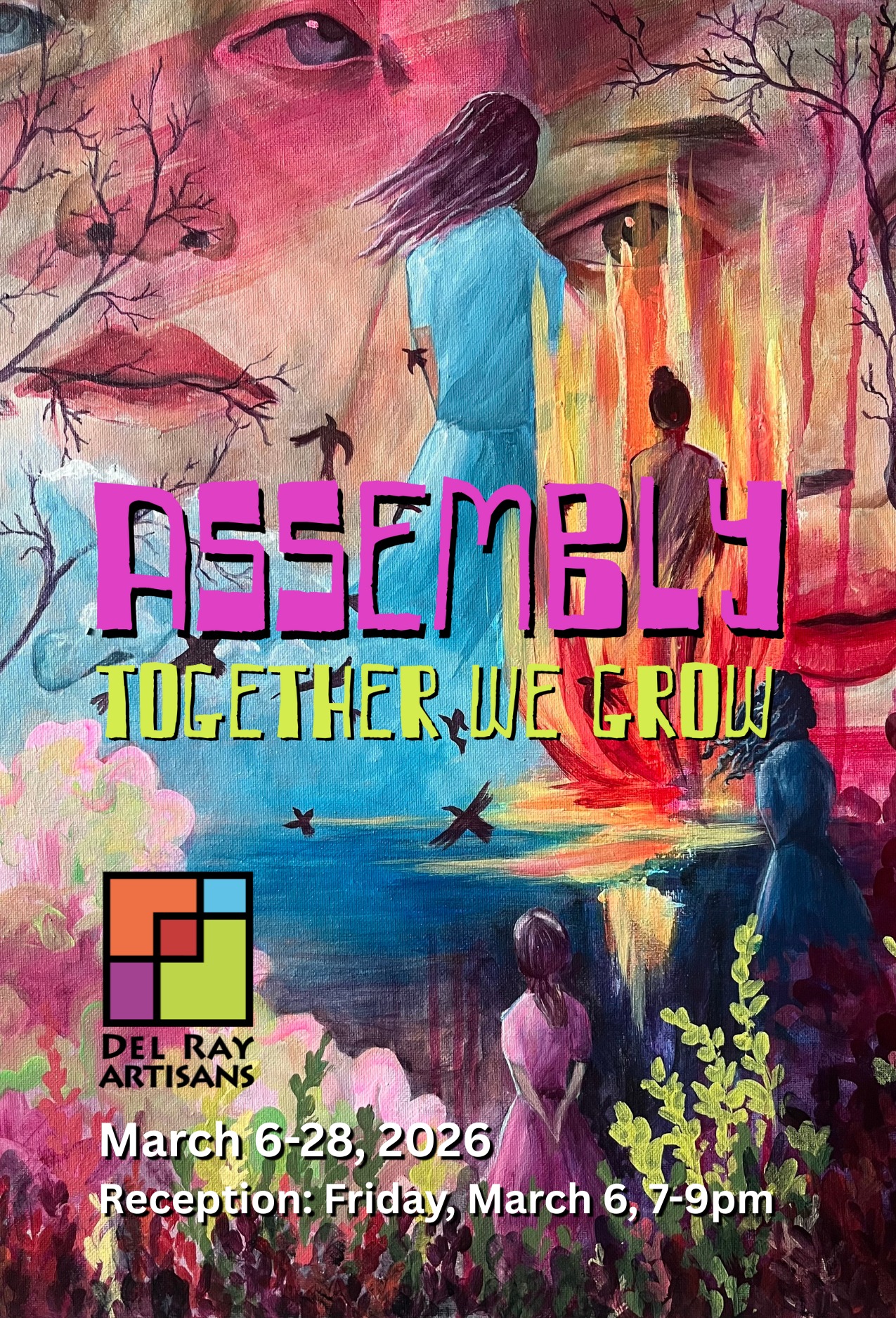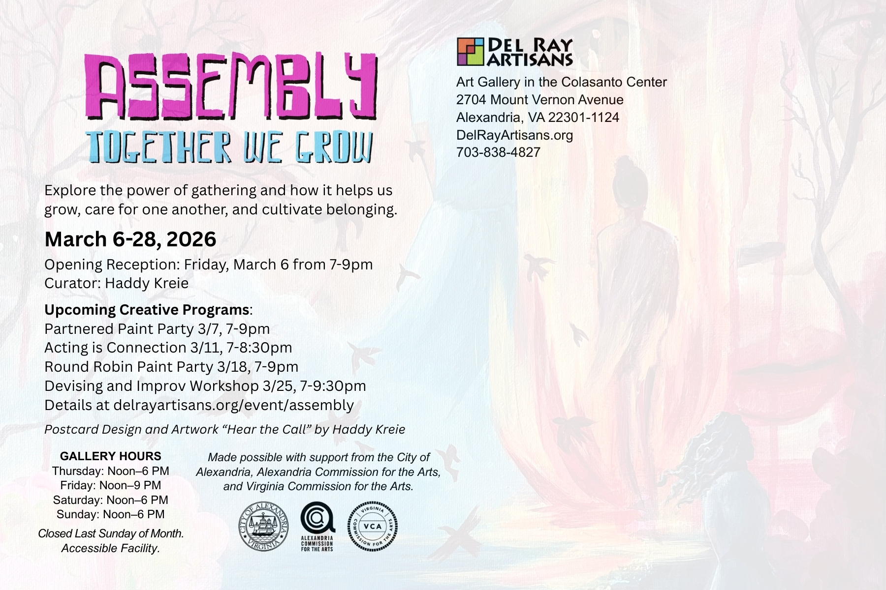 The Assembly: Together We Grow art exhibit runs from March 6–28, 2026 at Del Ray Artisans gallery in the Colasanto Center, 2704 Mount Vernon Avenue, Alexandria, Virginia 22301. Gallery hours are Thursday 12-6pm, Friday 12-9pm, Saturday 12-6pm, and Sunday 12-6pm (closed March 1 and March 29).